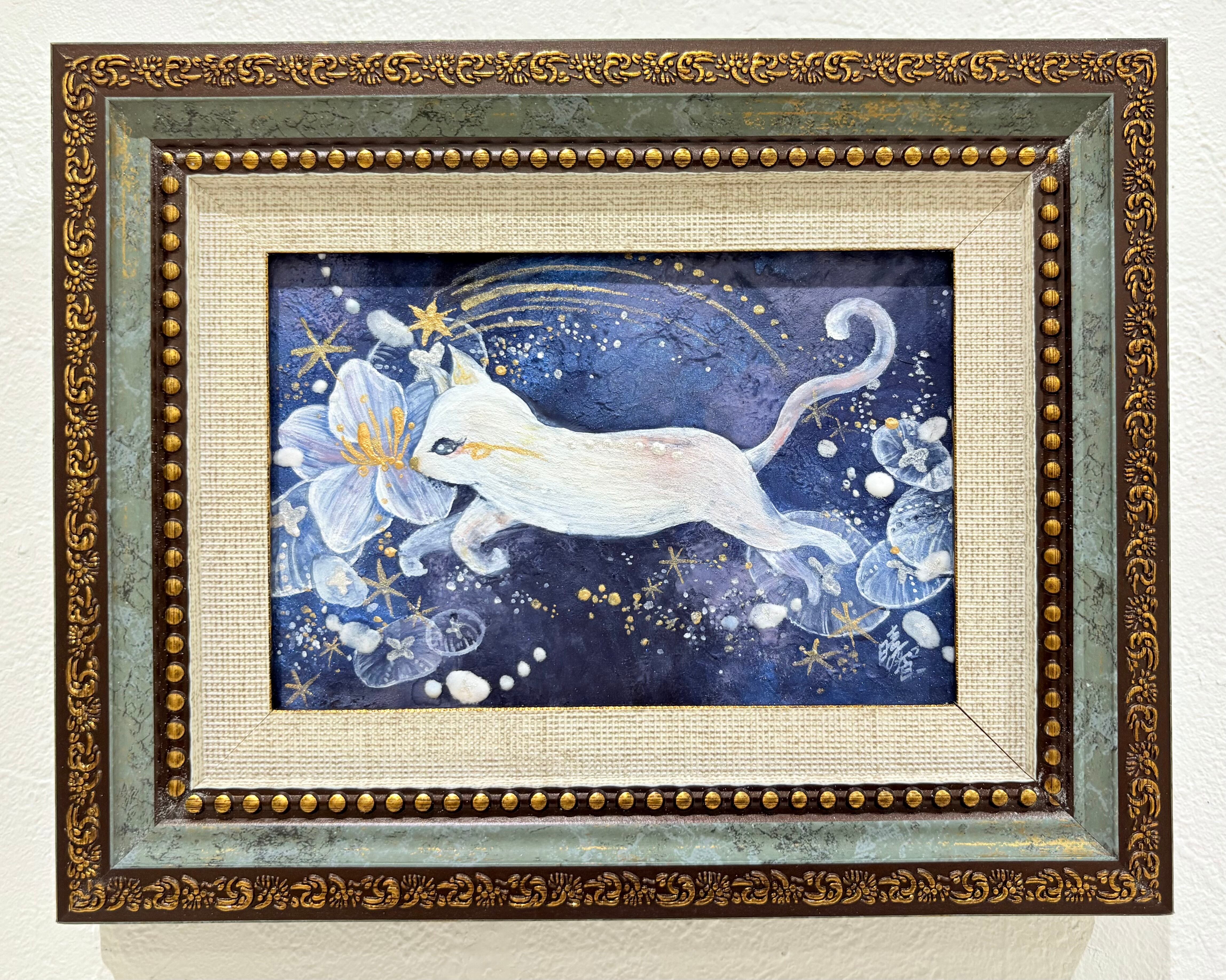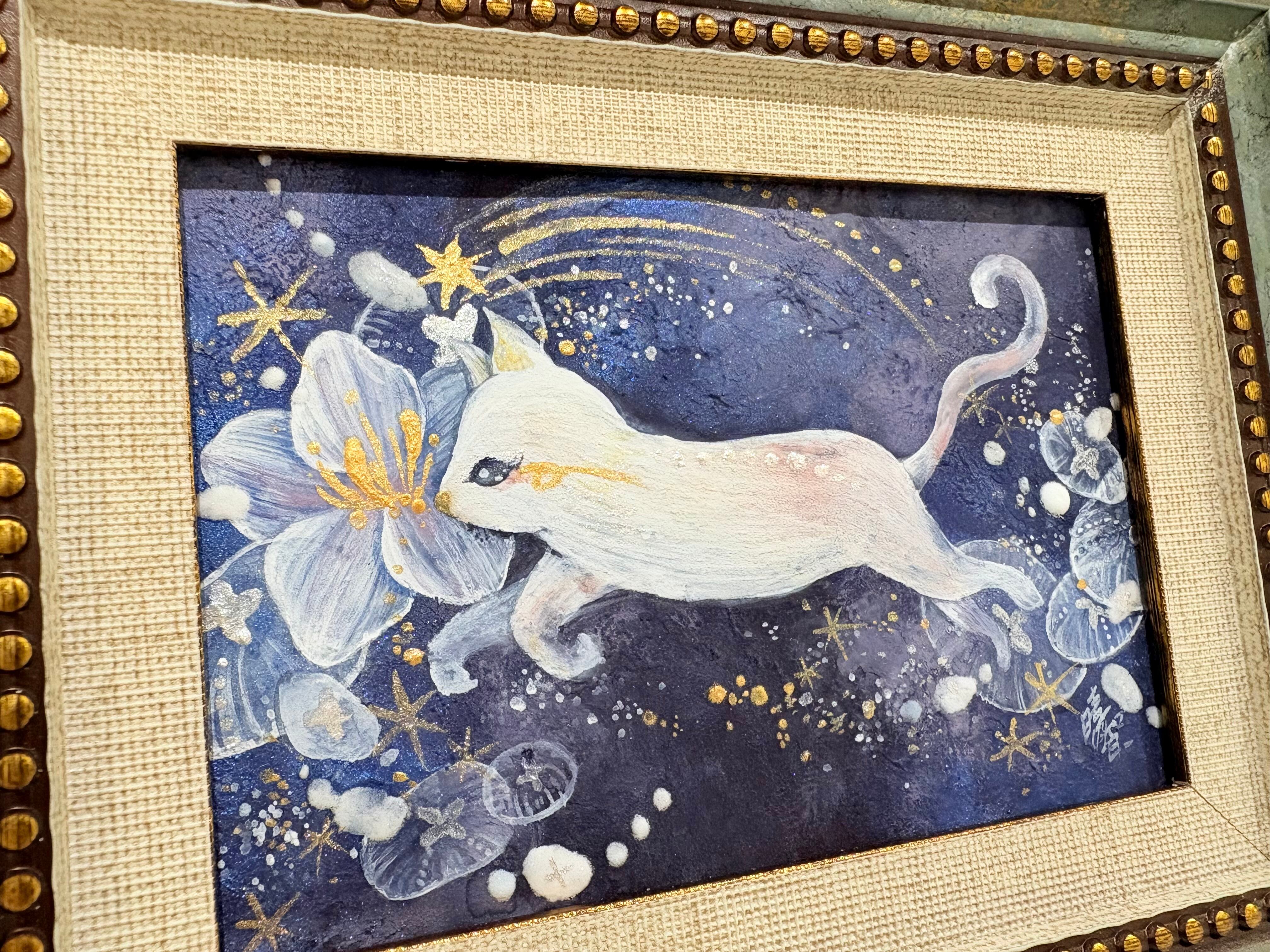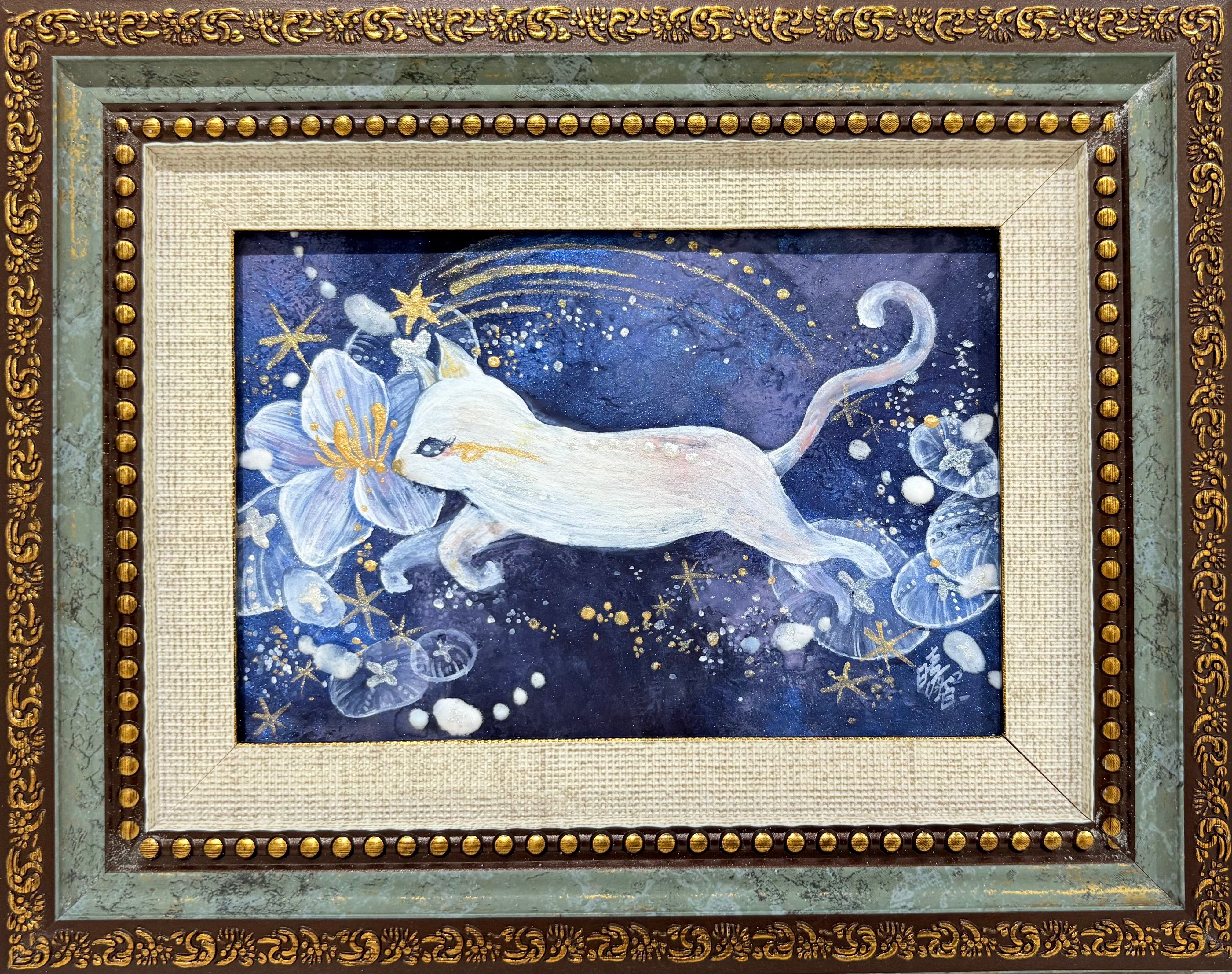 深い紺色にパール系の絵具(雲母)をなじませた背景なので