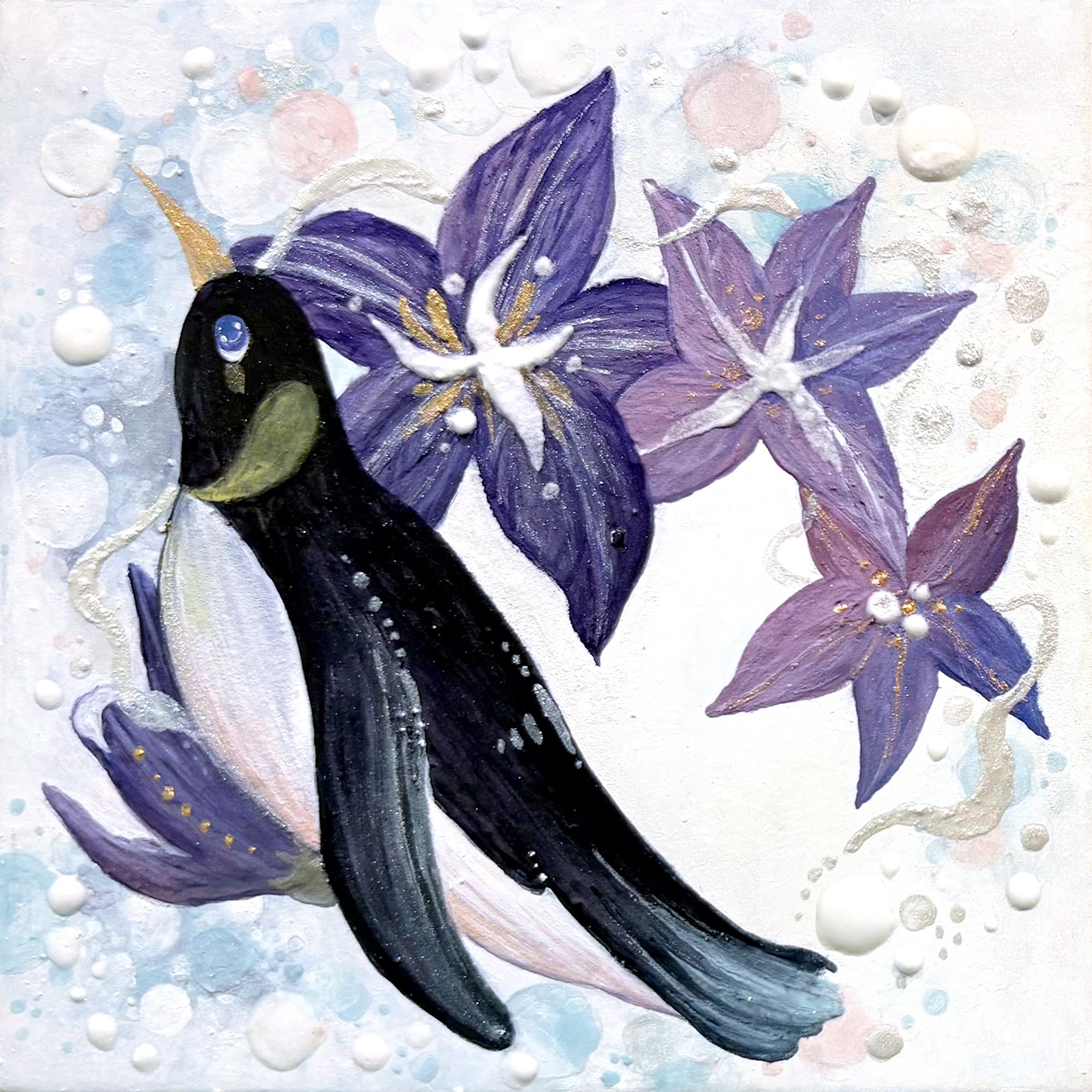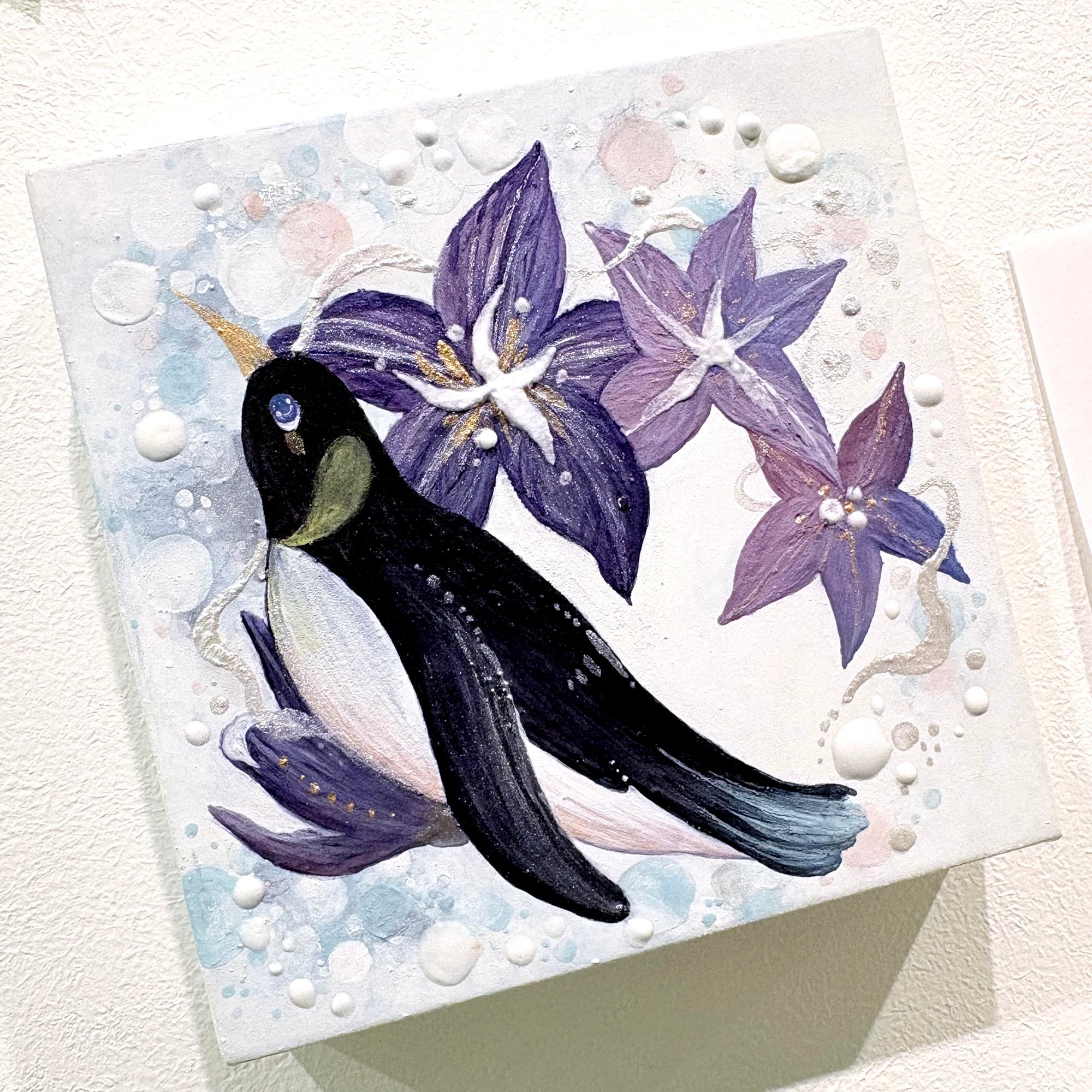 キキョウのきらめきと泳ぐペンギン。