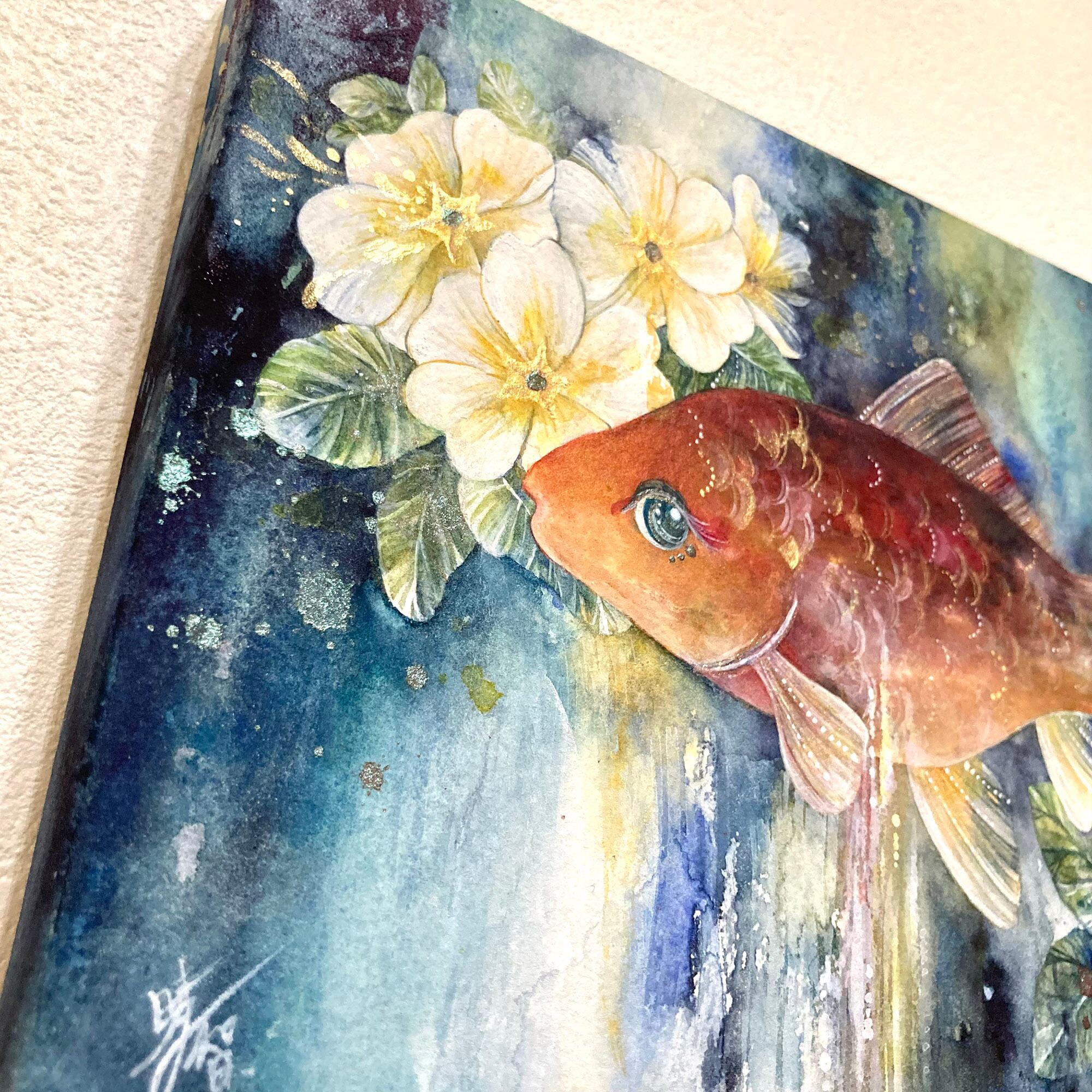 青緑色の背景を泳ぐ金魚と白い花の絵が飾られた壁を見つけました。